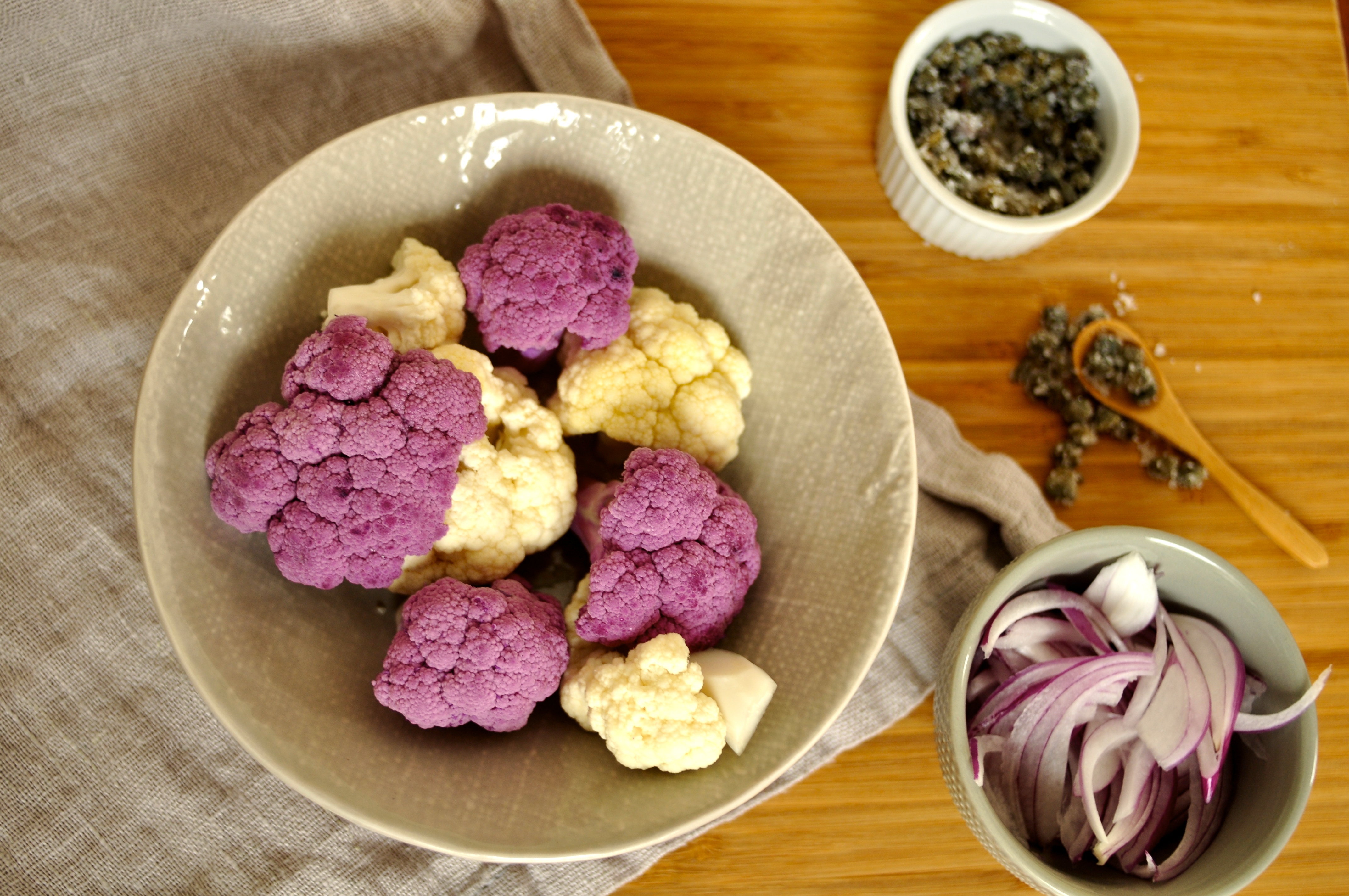 We have been tinkering with roasted cauliflower in caper dijon vinaigrette and marinated red onions. It’s a powerful punch of strong flavors which, truth be told, is not for the faint-of-heart. Going light on the capers and the garlic is key if you don’t want to be overwhelmed at your first date with this delicious salad.