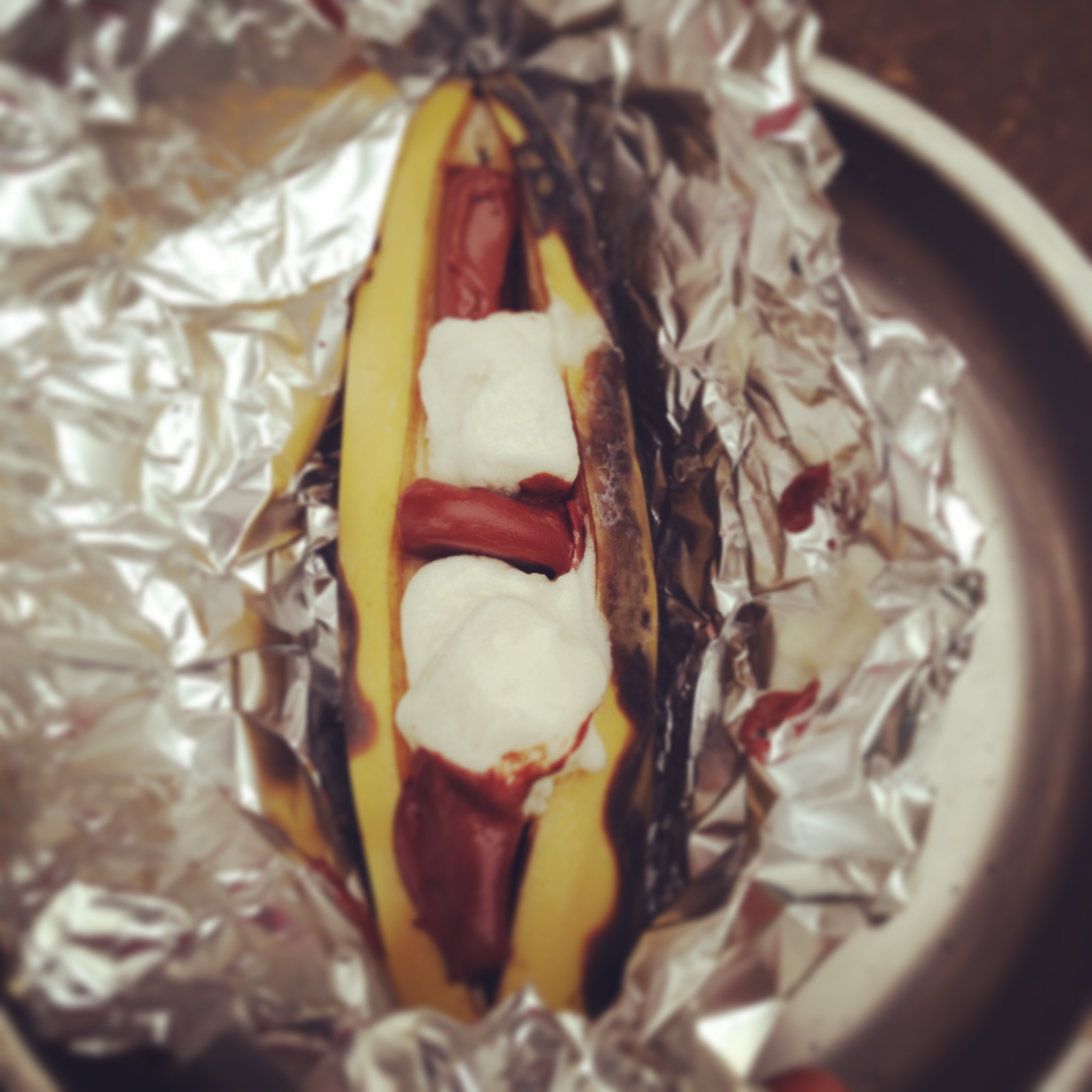 Wrap banana with aluminum foil and center on hot embers, cut side up, for about 5-10 minutes or until marshmallows melt and are golden brown.